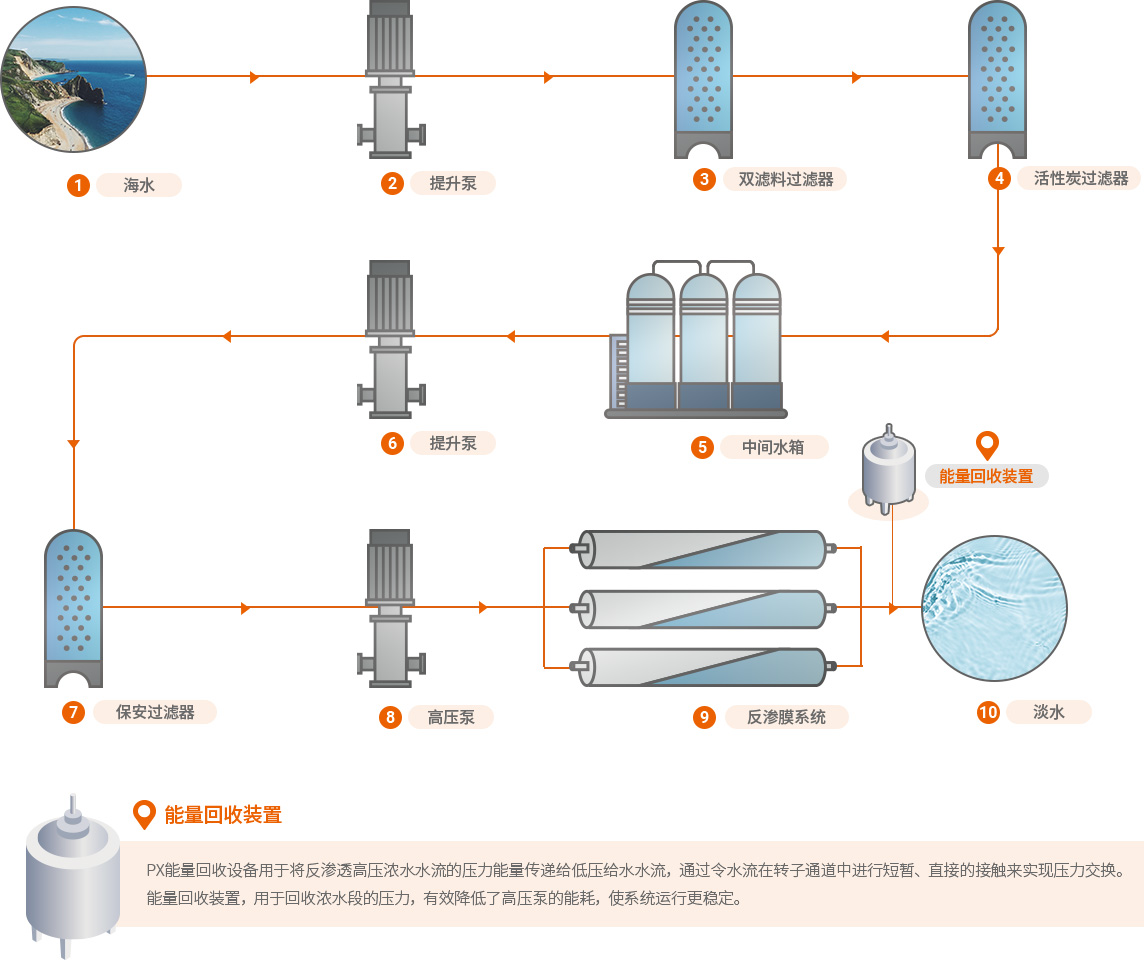 島用海水的預(yù)處理過程比較簡單,整套設(shè)備的彈性也很大,在高峰期時(shí),海水淡化處理的產(chǎn)水量可以超過設(shè)備的設(shè)計(jì)值,在低谷的時(shí)期,設(shè)備能提供額定產(chǎn)水量,整套設(shè)備動(dòng)力消耗少,可以降低設(shè)備的制水成本,整套設(shè)備安全可靠,絕對不會(huì)出現(xiàn)濃水與產(chǎn)品水相混的現(xiàn)象。