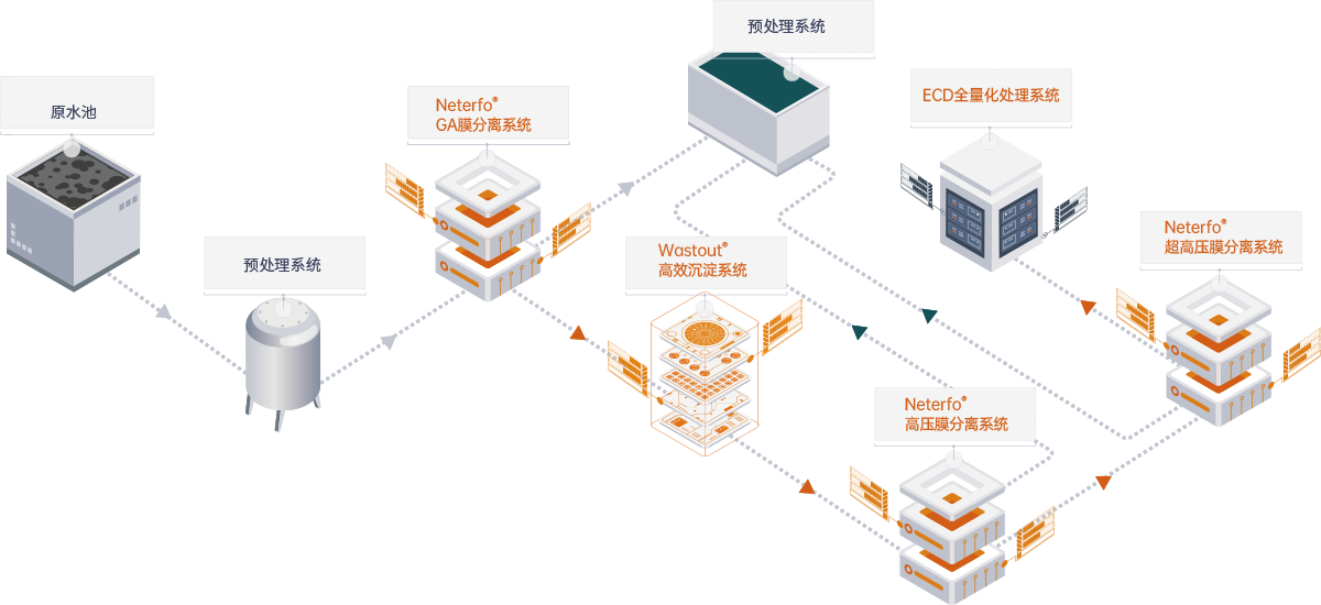 本項(xiàng)目設(shè)計工藝采用預(yù)處理系統(tǒng)、自主知識產(chǎn)權(quán)Neterfo?極限分離系統(tǒng)(包括低中高壓系列)與Wastout?微波高效沉淀系統(tǒng)、MVR蒸發(fā)結(jié)晶系統(tǒng)等工藝靈活組合,打破零排放行業(yè)膜濃縮前除硬度傳統(tǒng)工藝路線,DEL亞滲透膜與Wastout?微波高效沉淀技術(shù)結(jié)合,實(shí)現(xiàn)后除硬度,相較普通零排放工藝節(jié)約運(yùn)行成本30%以上,達(dá)到低投資低運(yùn)行成本雙收益。