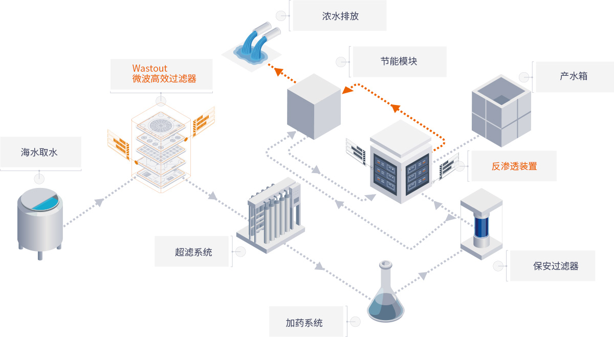 預(yù)處理針對性將水中的濁度、藻類等污染源作為核心對象,采用Wastout技術(shù)高效去除。膜系統(tǒng)選用寬流道、抗污染能力強、清洗恢復(fù)性好的膜產(chǎn)品。